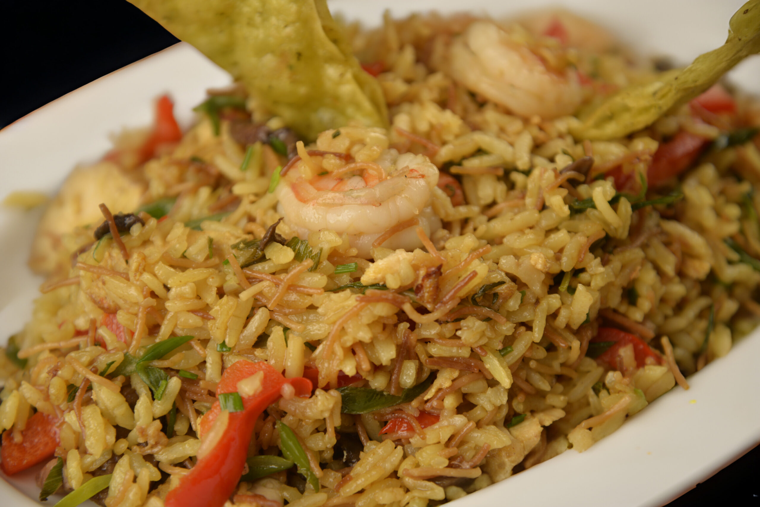 Camarones ecuatorianos salteados y Pollo asado acompañados de arroz árabe o fideos thai salteados con cebollín, champiñones y pimentón